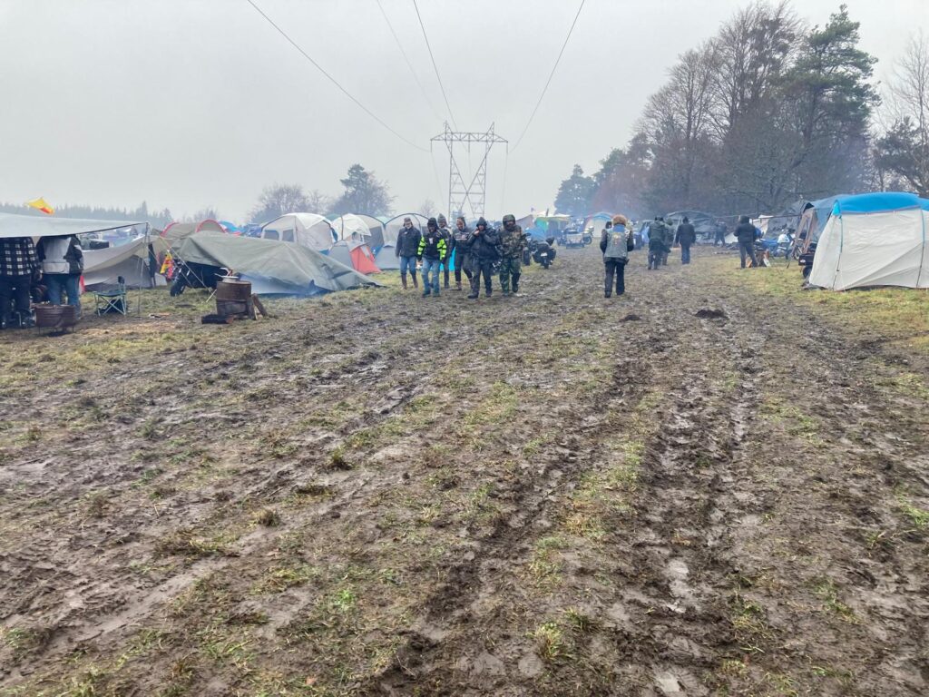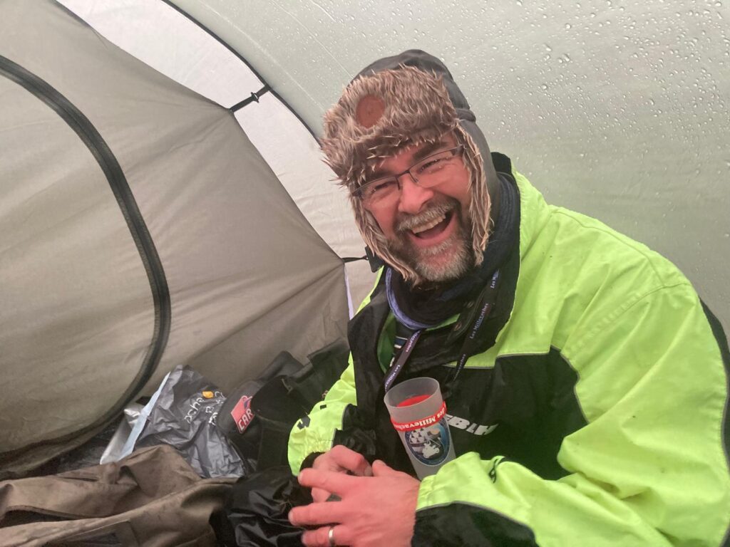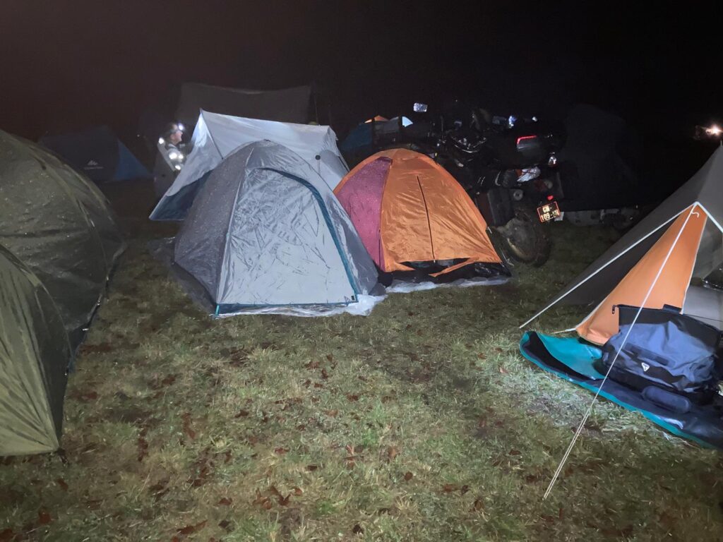 Bim, dans la merdasse. Je remonte et reperd l’équilibre sur la droite : Pas de jaloux dans la gadoue. J’envisage de rester là, mais il y a déjà beaucoup de monde et, bon, on préfère m’aider à aller plus loin. Moins gras, pas de chute, on fini en haut du champs pour l’installation nocturne des guitounes : Cette année, j’en ai pris 2. Une pour moi et une pour mes équipements. Je pense que c’est une bonne option de confort.