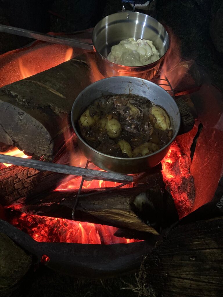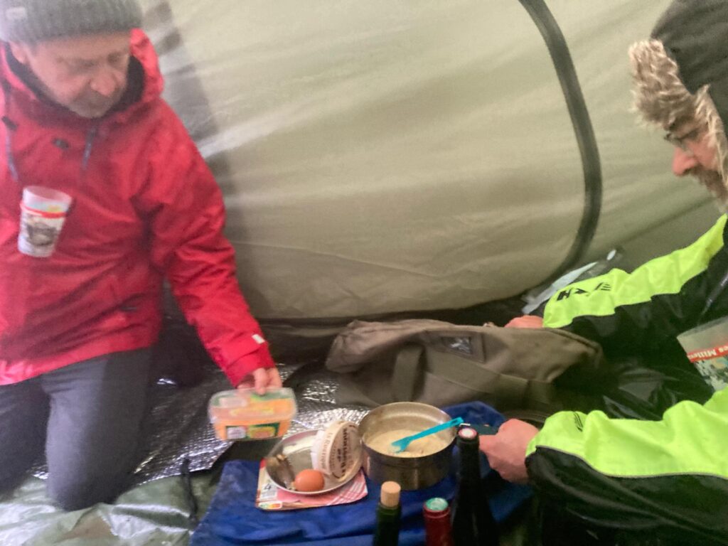 On est un peu rincés, le temps est très humide et nous finissons par partager un braséro avec un autre petit groupe, de quoi finir assis, réchauffés, à faire cuire nos plats, Florence m’a préparé un stock de ragoût de boeuf, ça se prête parfaitement à la situation. Petit tout à l’abrevoir pour se réchauffer, quelques photos et rapidement, bonne nuit les petits !